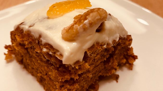 Deze pompoencake is echt super lekker. Die moet je maken! Met pumpkinspices, al kun je net zo goed een potje koek- en speculaaskruiden kopen, daar zitten nagenoeg dezelfde ingrediënten in.