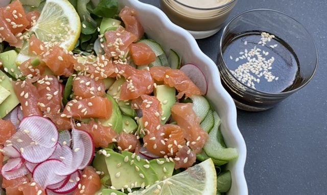 Salade met gerookte zalm en sesam-sojadressing