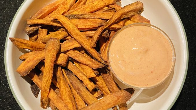 Zoete aardappel frites met sriracha-mayosaus