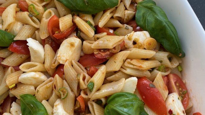 Deze eenvoudige pastasalade staat in een mum op tafel, heeft maar een paar ingrediënten en is lekker zomers.
