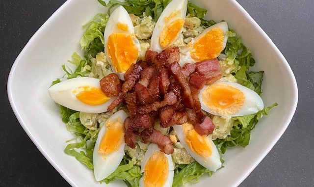 - leg de aardappelsalade er op en verdeel de eieren en spekjes erover.
